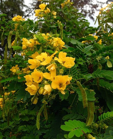 2.黄槐决明:相比于双荚决明,它的十枚雄蕊全部都可以生育。而且黄槐长出的花朵都比较大,花瓣是鲜黄或深黄色。花期较长,几乎全年都会开花,一半集中在三到十二月份。